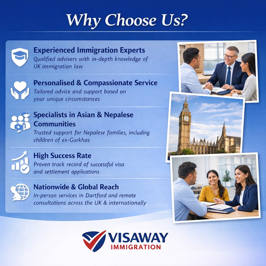 Visaway Immigration is an Immigration Advice Authority: IAA-regulated immigration firm based in Dartford, Kent. We provide professional and reliable UK immigration advice and visa support to clients across the UK and internationally, offering in-person consultations in Dartford as well as remote support nationwide. We are also proud to be one of recognized Nepalese immigration firm in the UK.